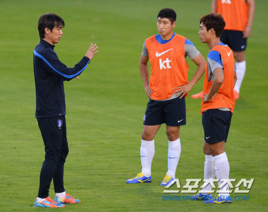 2014 브라질월드컵 홍명보호가 13일 오전(한국시간) 브라질 이구아수 훈련 캠프에서 이틀째 훈련에 돌입했다. 홍명보 감독이 미니게임에 앞서 이근호와 박주영에게 훈련내용을 지시하고 있다.