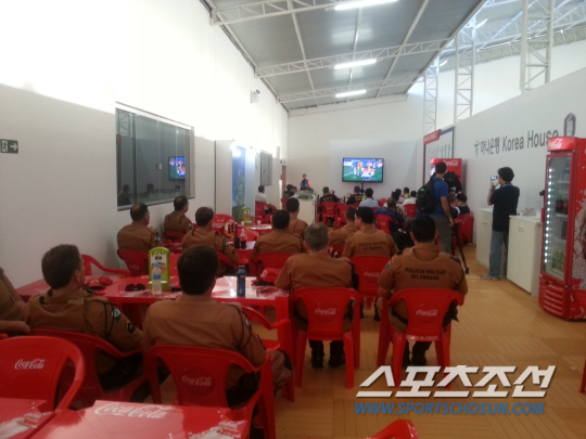 ◇홍명보호 경호를 위해 브라질 이구아수의 플라멩구 스타디움에 파견된 현지 경찰, 군인들이 13일(한국시각) 코리아하우스 내에 설치된 TV를 통해 브라질-크로아티아전을 관전하고 있다. 이구아수(브라질)=박상경 기자 ppark@sportschosun.com