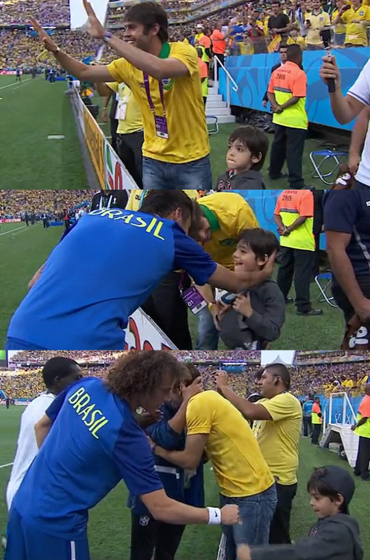 제일 먼저 브라질 대표팀 스트라이커 프레드가 카카를 알아보고 다가가 인사를 한 뒤 아들 루카와도 인사를 나눴다. 이어 브라질 선수들이 연이어 다가와 카카와 포옹을 나누며 선전을 다짐했다. 브라질 에이스 네이마르는 루카의 머리를 어루만지며 귀여워했다. 장난기가 다분한 수비수 루이스는 루카에 '주먹 세리머니'를 제안, 루카는 고사리 손으로 응하며 귀여운 매력을 발산했다.