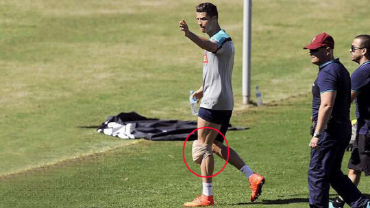 | 호날두가 무릎에 거대한 아이스팩을 붙이고 있다. |