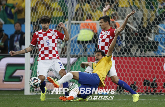 브라질 공격수 프레드가 크로아티아 수비수 데얀 로브렌의 파울에 넘어지고 있다. 프레드가 얻어낸 파울은 네이마르의 페널티킥으로 연결돼 이날의 결승골이 됐다. ⓒAFPBBNews = News1