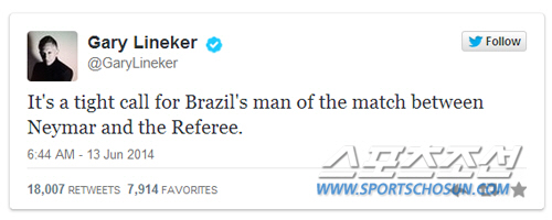 영국의 축구 전설 게리 리네커(54)가 브라질-크로아티아 전 심판 판정에 대해 강도높게 비판했다.