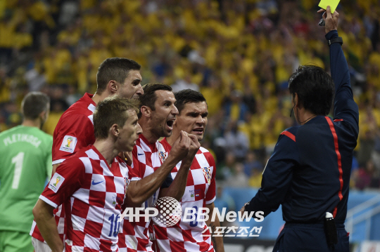 ◇니시무라 주심이 페널티킥을 선언한 후 옐로 카드를 꺼내자 크로아티아 선수들이 강하게 반발하고 있다. 상파울루(브라질)=ⓒAFPBBNews = News1