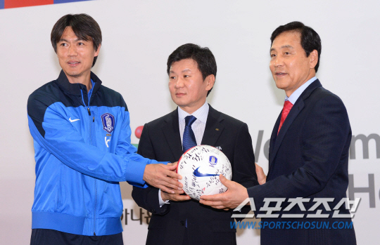 김정태 하나금융그룹 회장이 홍명보 감독에게 응원의 메시지가 담긴 축구공을 전달하고 있다.