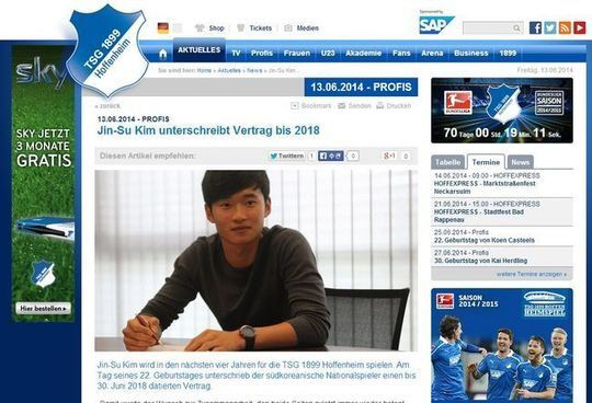 호펜하임은 13일(한국시각) 구단 공식 홈페이지를 통해 '김진수가 자신의 생일인 오늘 호펜하임과 계약을 맺고 2018년 6월까지 뛰게 됐다'고 밝혔다. 김진수는 부상으로 브라질월드컵에 출전하지 못했지만, 유럽파 대열에 합류하며 성장의 발판을 마련했다. 2014~2015시즌 독일 분데스리가에서는 손흥민, 류승우(이상 레버쿠젠), 구자철, 박주호(이상 마인츠), 지동원(도르트문트), 홍정호(아우크스부르크)와 함께 김진수의 모습도 볼 수 있게 됐다.