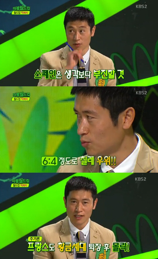 이영표 위원은 브라질월드컵 특집 프로그램에서 "스페인이 몰락할 수도 있다. 칠레와 스페인과의 경기에서는 칠레가 이길 가능성이 높다. 6대 4 정도라고 본다"고 말했다.