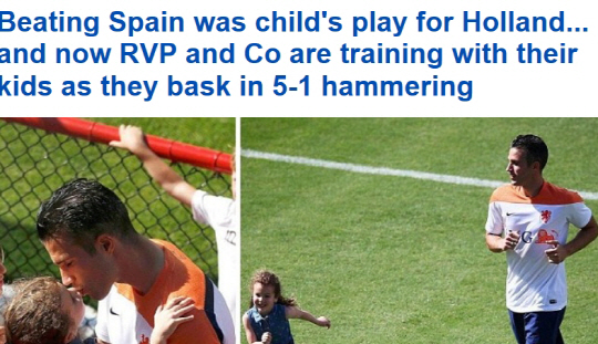 스페인전 대승 직후에도 선수들은 아이들과 함께 회복훈련을 했다. 영국 일간 데일리메일은 판페르시 등 선수들이 아들딸과 훈련장에서 몸을 푸는 사진을 공개했다. 판페르시는 딸 디나와 훈련장에서 즐겁게 공놀이를 하고 함께 달리며 활짝 웃었다. 오렌지군단이 가족의 힘, 해피 바이러스로 펄펄 날고 있다. 스포츠2팀