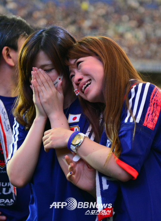 2014 브라질 월드컵 C조 예선 첫 경기에서 일본 축구 대표팀이 코트디브아르에게 1대2로 역전패를 당하자 도쿄돔에 모여 응원을 하던 축구팬들이 울음을 터뜨리고 있다. ⓒAFPBBNews = News1