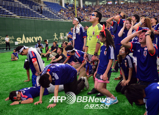 2014 브라질 월드컵 C조 예선 첫 경기에서 일본 축구 대표팀이 코트디브아르에게 1대2로 역전패를 당하자 도쿄돔에 모여 응원을 하던 축구팬들이 실망한 채 울음을 터뜨리고 있다.