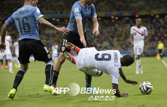 15일 브라질월드컵 C조 1차전에서 코스타리카가 우루과이를 3대1로 눌렀다. 코스타리카 캠벨이 상대 수비에 걸려 넘어지고 있다. ⓒAFPBBNews = News1