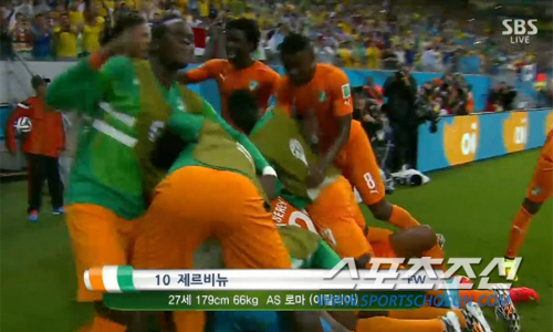 이어 코트디부아르는 2분 뒤 역시 오리에의 크로스를 이번에는 제르비뉴가 헤딩골로 연결, 2-1로 역전시켰다.