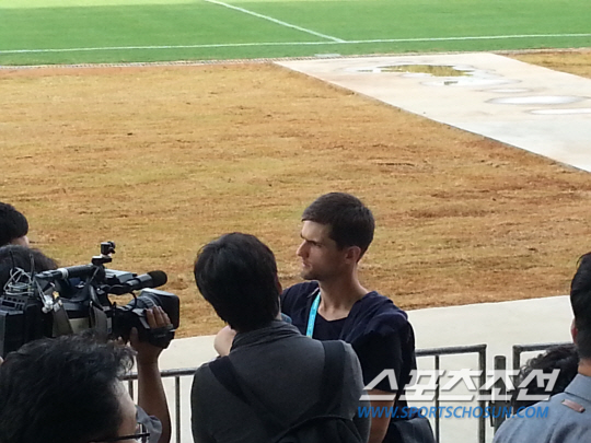 ◇러시아 소비에트 스포츠의 아르뎀 로카노프 기자(가운데)가 16일(한국시각) 브라질 쿠이아바의 마투그로수연방대학 운동장에서 열린 월드컵대표팀 훈련에 앞서 한국 취재진들의 인터뷰 요청에 응하고 있다. 쿠이아바(브라질)=박상경 기자 ppark@sportschosun.com