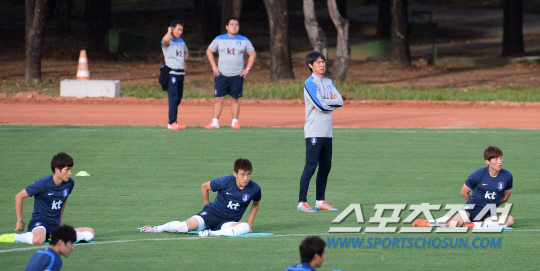 2014 브라질월드컵 홍명보호가 16일 오전(한국시간) 러시아와의 격전지가 될 브라질 쿠이아바에 도착해 첫 훈련을 실시했다. 홍명보 감독이 스트레칭으로 훈련을 준비하는 태극전사들을 바라보고 있다.