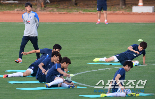 2014 브라질월드컵 홍명보호가 16일 오전(한국시간) 러시아와의 격전지가 될 브라질 쿠이아바에 도착해 첫 훈련을 실시했다. 홍명보 감독이 스트레칭으로 훈련을 준비하는 태극전사들을 바라보고 있다.