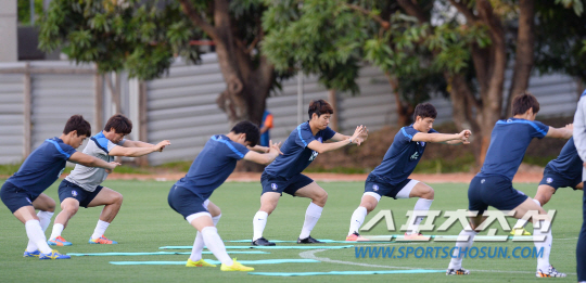 2014 브라질월드컵 홍명보호가 16일 오전(한국시간) 러시아와의 격전지가 될 브라질 쿠이아바에 도착해 첫 훈련을 실시했다. 태극전사들이 쿠이아바 마투그로수 연방대학 경기장에서 스트레칭으로 훈련을 준비하고 있다.