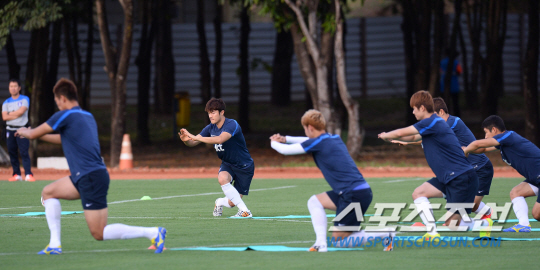 2014 브라질월드컵 홍명보호가 16일 오전(한국시간) 러시아와의 격전지가 될 브라질 쿠이아바에 도착해 첫 훈련을 실시했다. 태극전사들이 쿠이아바 마투그로수 연방대학 경기장에서 스트레칭으로 훈련을 준비하고 있다.