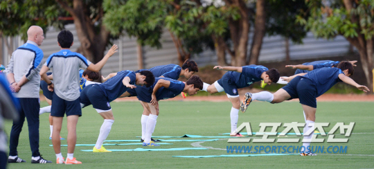2014 브라질월드컵 홍명보호가 16일 오전(한국시간) 러시아와의 격전지가 될 브라질 쿠이아바에 도착해 첫 훈련을 실시했다. 태극전사들이 쿠이아바 마투그로수 연방대학 경기장에서 스트레칭으로 훈련을 준비하고 있다.