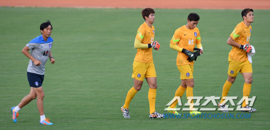 2014 브라질월드컵 홍명보호가 16일 오전(한국시간) 러시아와의 격전지가 될 브라질 쿠이아바에 도착해 첫 훈련을 실시했다. 김봉수 코치와 이범영, 김승규, 정성룡 골키퍼 3인방이 러닝으로 몸을 풀고 있다.