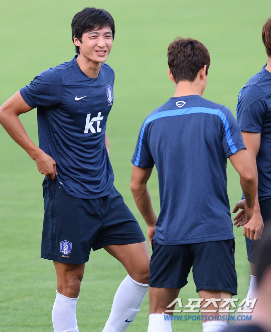 2014 브라질월드컵 홍명보호가 16일 오전(한국시간) 러시아와의 격전지가 될 브라질 쿠이아바에 도착해 첫 훈련을 실시했다. 곽태휘가 훈련을 준비하던 이청용에게 웃으면서 말을 건네고 있다.