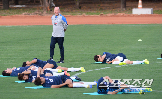 2014 브라질월드컵 홍명보호가 16일 오전(한국시간) 러시아와의 격전지가 될 브라질 쿠이아바에 도착해 첫 훈련을 실시했다. 안톤코치가 스트레칭으로 훈련을 준비하는 태극전사들을 주시하고 있다.