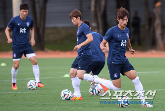 2014 브라질월드컵 홍명보호가 16일 오전(한국시간) 러시아와의 격전지가 될 브라질 쿠이아바에 도착해 첫 훈련을 실시했다. 홍정호와 태극전사들이 간단한 드리블로 훈련을 시작하고 있다.