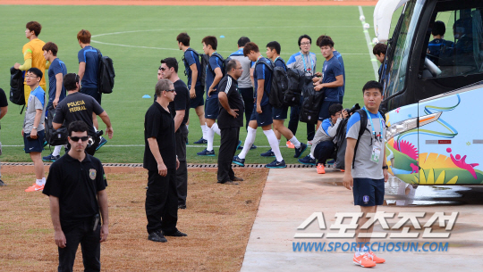 2014 브라질월드컵 홍명보호가 16일 오전(한국시간) 러시아와의 격전지가 될 브라질 쿠이아바에 도착해 첫 훈련을 실시했다. 태극전사들이 브라질 경찰들의 삼엄한 경호를 받으며 쿠이아바 마투그로수 연방대학 경기장에 도작하고 있다.