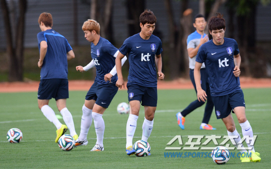 2014 브라질월드컵 홍명보호가 16일 오전(한국시간) 러시아와의 격전지가 될 브라질 쿠이아바에 도착해 첫 훈련을 실시했다. 박주영과 태극전사들이 간단한 드리블로 훈련을 시작하고 있다.