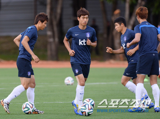 2014 브라질월드컵 홍명보호가 16일 오전(한국시간) 러시아와의 격전지가 될 브라질 쿠이아바에 도착해 첫 훈련을 실시했다. 박주영과 태극전사들이 간단한 드리블로 훈련을 시작하고 있다.