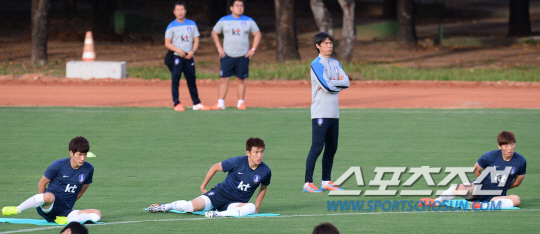 2014 브라질월드컵 홍명보호가 16일 오전(한국시간) 러시아와의 격전지가 될 브라질 쿠이아바에 도착해 첫 훈련을 실시했다. 홍명보 감독이 스트레칭으로 훈련을 준비하는 태극전사들을 바라보고 있다.