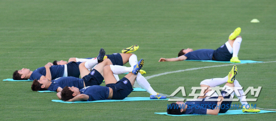 2014 브라질월드컵 홍명보호가 16일 오전(한국시간) 러시아와의 격전지가 될 브라질 쿠이아바에 도착해 첫 훈련을 실시했다. 태극전사들이 쿠이아바 마투그로수 연방대학 경기장에서 스트레칭으로 훈련을 준비하고 있다.