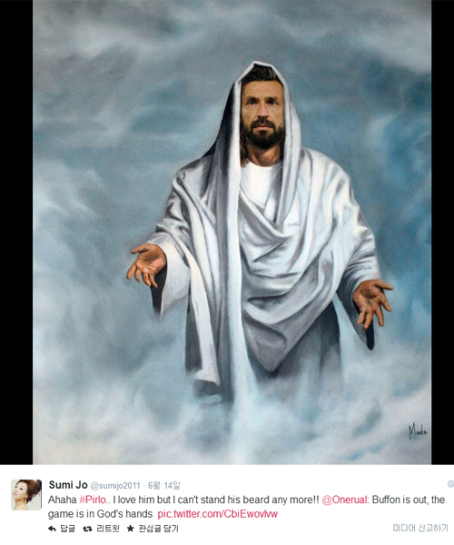 조수미는 14일 자신의 SNS에 "나는 피를로를 사랑한다, 그런데 그의 수염은 더이상 참을 수가 없다"라는 글과 함께 피를로를 예수와 합성한 사진을 올렸다.