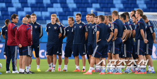2014브라질월드컵 조별예선 H조 1차전에서 한국과 맞붙을 러시아대표팀이 경기를 하루 앞둔 17일 오전(한국시간) 쿠이아바 아레나 판타날 경기장에서 적응훈련을 하고있다. 파비오 카펠로 러시아 감독과 선수단이 훈련에 앞서 미팅을 하고 있다.