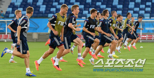 2014브라질월드컵 조별예선 H조 1차전에서 한국과 맞붙을 러시아대표팀이 경기를 하루 앞둔 17일 오전(한국시간) 쿠이아바 아레나 판타날 경기장에서 적응훈련을 하고있다.