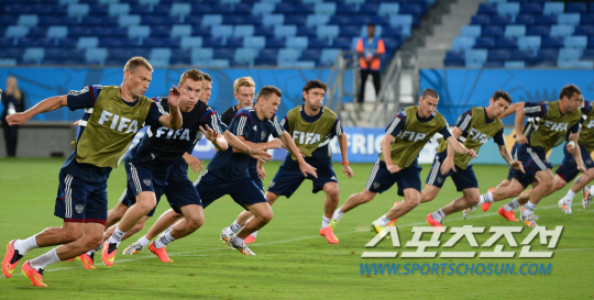 2014브라질월드컵 조별예선 H조 1차전에서 한국과 맞붙을 러시아대표팀이 경기를 하루 앞둔 17일 오전(한국시간) 쿠이아바 아레나 판타날 경기장에서 적응훈련을 하고있다.