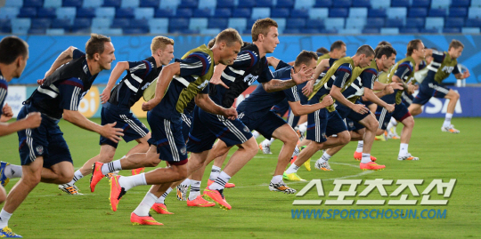 2014브라질월드컵 조별예선 H조 1차전에서 한국과 맞붙을 러시아대표팀이 경기를 하루 앞둔 17일 오전(한국시간) 쿠이아바 아레나 판타날 경기장에서 적응훈련을 하고있다.