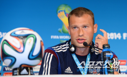 2014 브라질월드컵 러시아대표팀 카펠로감독과 바실리 베레주츠키가 한국과의 결전을 앞둔 17일 오전(한국시간) 쿠이아바 아레나 판타날 경기장에서 공식기자회견을 갖고 있다.