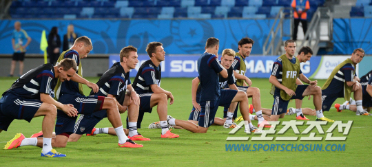 2014브라질월드컵 조별예선 H조 1차전에서 한국과 맞붙을 러시아대표팀이 경기를 하루 앞둔 17일 오전(한국시간) 쿠이아바 아레나 판타날 경기장에서 적응훈련을 하고있다.
