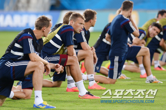 2014브라질월드컵 조별예선 H조 1차전에서 한국과 맞붙을 러시아대표팀 주장 바실리 베레주츠키가 경기를 하루 앞둔 17일 오전(한국시간) 쿠이아바 아레나 판타날 경기장에서 적응훈련을 하고있다.