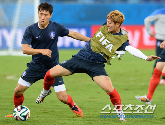 2014 브라질월드컵 홍명보호가 러시아와 결전을 하루앞둔 17일 오전(한국시간) 쿠이아바 아레나 판타날 경기장에서 적응훈련을 하고있다. 손흥민과 지동원이 미니게임 중 치열한 볼경합을 벌이고 있다.
