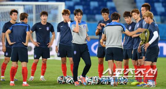 2014 브라질월드컵 홍명보호가 러시아와 결전을 하루 앞둔 17일 오전(한국시간) 쿠이아바 아레나 판타날 경기장에서 적응훈련을 실시했다. 홍명보 감독과 선수들이 미니게임을 준비하고 있다.