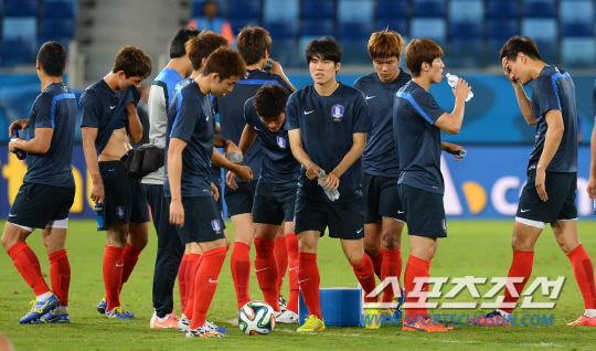 2014 브라질월드컵 홍명보호가 러시아와 결전을 하루 앞둔 17일 오전(한국시간) 쿠이아바 아레나 판타날 경기장에서 적응훈련을 실시했다. 스트레칭을 마친 태극전사들이 물을 마시고 있다.