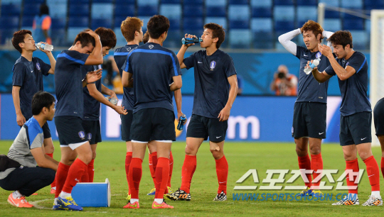 2014 브라질월드컵 홍명보호가 러시아와 결전을 하루 앞둔 17일 오전(한국시간) 쿠이아바 아레나 판타날 경기장에서 적응훈련을 실시했다. 스트레칭을 마친 태극전사들이 물을 마시고 있다.