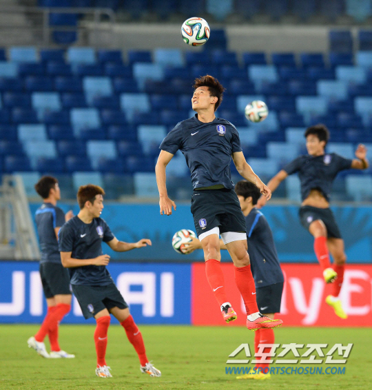 2014 브라질월드컵 홍명보호가 러시아와 결전을 하루 앞둔 17일 오전(한국시간) 쿠이아바 아레나 판타날 경기장에서 적응훈련을 실시했다. 지동원과 태극전사들이 헤딩훈련을 하고있다.