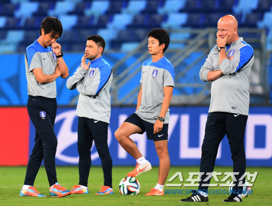 2014 브라질월드컵 홍명보호가 러시아와 결전을 하루 앞둔 17일 오전(한국시간) 쿠이아바 아레나 판타날 경기장에서 적응훈련을 실시했다. 홍명보 감독과 안톤코치가 선수들을 지켜보고 있다.