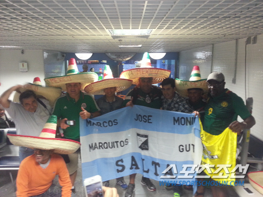 색다른 볼거리도 있습니다. 3명 이상의 소규모 집단이 생기게 되면 시도 때도 없이 아무데서나 응원을 펼칩니다. 월드컵대표팀을 취재하기 위해 이구아수에 갔을 때 우연히 공항에서 멕시코 팬들을 만났습니다. 비행기가 연착돼 짜증이 날 법도 한데 그 시간마저 즐겁게 보냅니다. 응원을 통해서 입니다. 10여명의 멕시코 팬들이 의자에 앉아 있다가 갑자기 일어섭니다. 멕시코의 전통 모자인 솜브레로를 쓰더니 노래를 합니다. 한국의 '대~한민국, 필승 코리아'처럼 그들만의 응원 노래와 구호가 있는지 일사분란하게 응원을 진행합니다. 공항 대기실에 앉아있던 수 많은 국적의 사람들이 모두 박수를 보내며 응원전을 즐겼습니다. 그때 아르헨티나의 한 팬이 국기를 들고 응원전에 가세했습니다. 사무엘 에토오의 이름이 적힌 카메룬 대표팀 유니폼을 입은 사람도 슬쩍 응원 대열에 합류했습니다. 이들의 응원전 덕분에 공항 분위기도 밝아졌습니다.