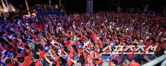 한국과 러시아의 2014 브라질 월드컵 첫 경기가 예정된 18일 새벽 서울 영동대로에서 길거리 응원전이 펼쳐졌다. 힘찬 응원전을 펼치는 붉은악마의 모습.