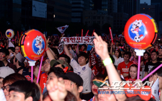 18일 오전 서울 광화문광장에서 브라질 월드컵 조별예선 첫 경기 한국 대 러시아 전을 맞아 월드컵 거리응원이 펼쳐졌다. 거리응원전은 서울 광화문광장과 영동대로를 비롯해 전국 20여곳에서 펼쳐졌다. 많은 시민들이 거리응원에 참여해 함께 응원을 펼치고 있다.