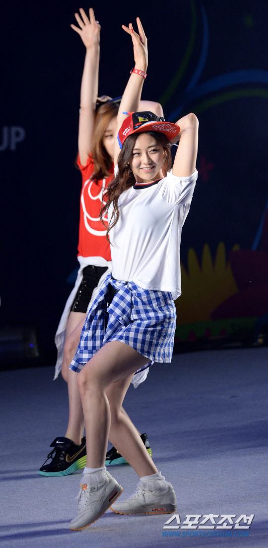 한국과 러시아의 2014 브라질 월드컵 첫 경기가 예정된 18일 새벽 서울 코엑스 앞 영동대로에서 길거리 응원전이 펼쳐졌다. 레이디스코드가 멋진 무대를 펼치고 있다.