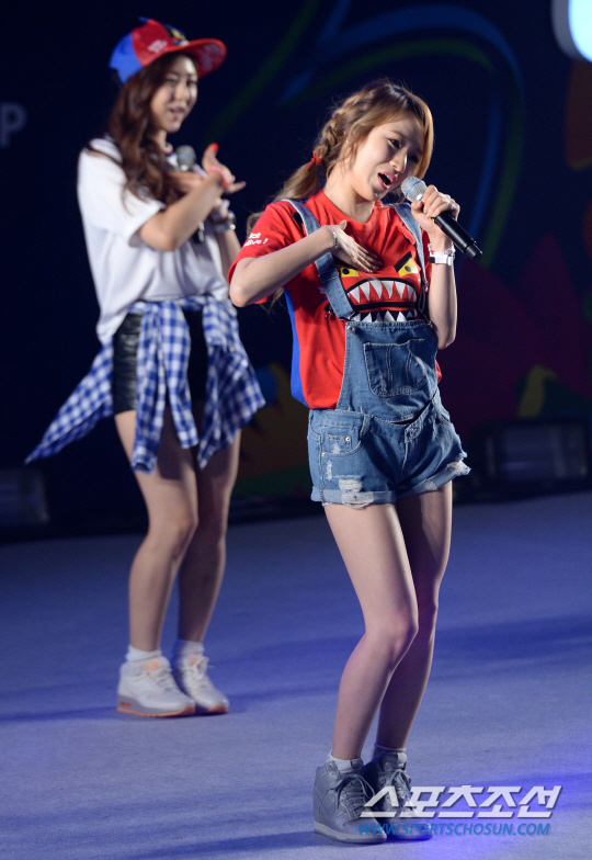 한국과 러시아의 2014 브라질 월드컵 첫 경기가 예정된 18일 새벽 서울 코엑스 앞 영동대로에서 길거리 응원전이 펼쳐졌다. 레이디스코드가 멋진 무대를 펼치고 있다.
