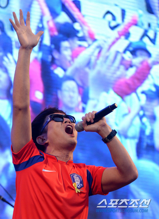 18일 오전 서울 광화문광장에서 브라질 월드컵 조별예선 첫 경기 한국 대 러시아 전을 맞아 월드컵 거리응원이 펼쳐졌다. 거리응원전은 서울 광화문광장과 영동대로를 비롯해 전국 20여곳에서 펼쳐졌다. 윤형빈이 거리응원에 참여해 함께 응원을 펼치고 있다.